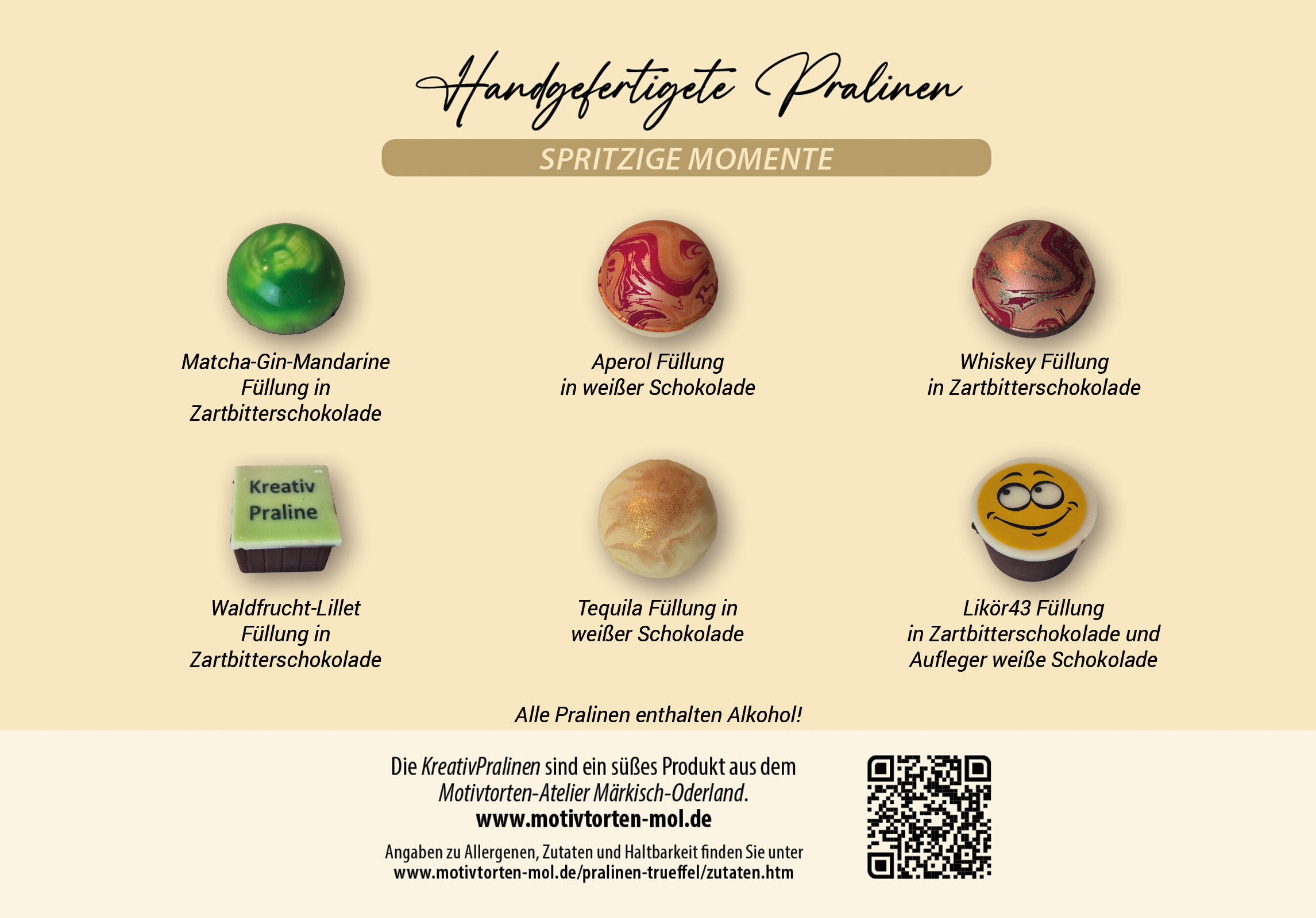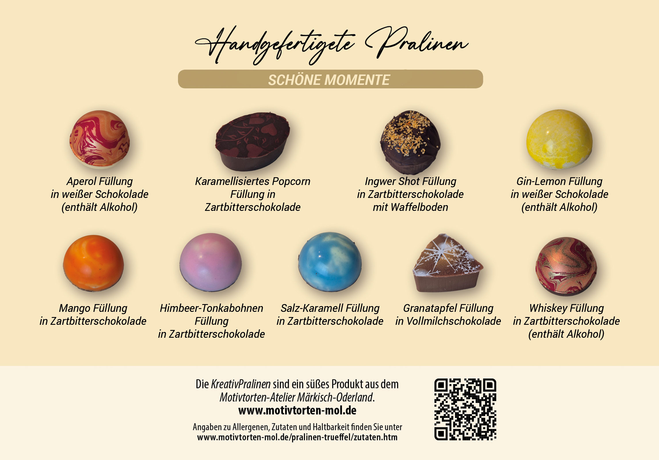 Inhalt: Himbeer-Kokos, Physalis-Orange, Mango, Granatapfel, Salz-Karamell, Nougat, Gin-Lemon, Erdbeer-Champagner, Whiskey